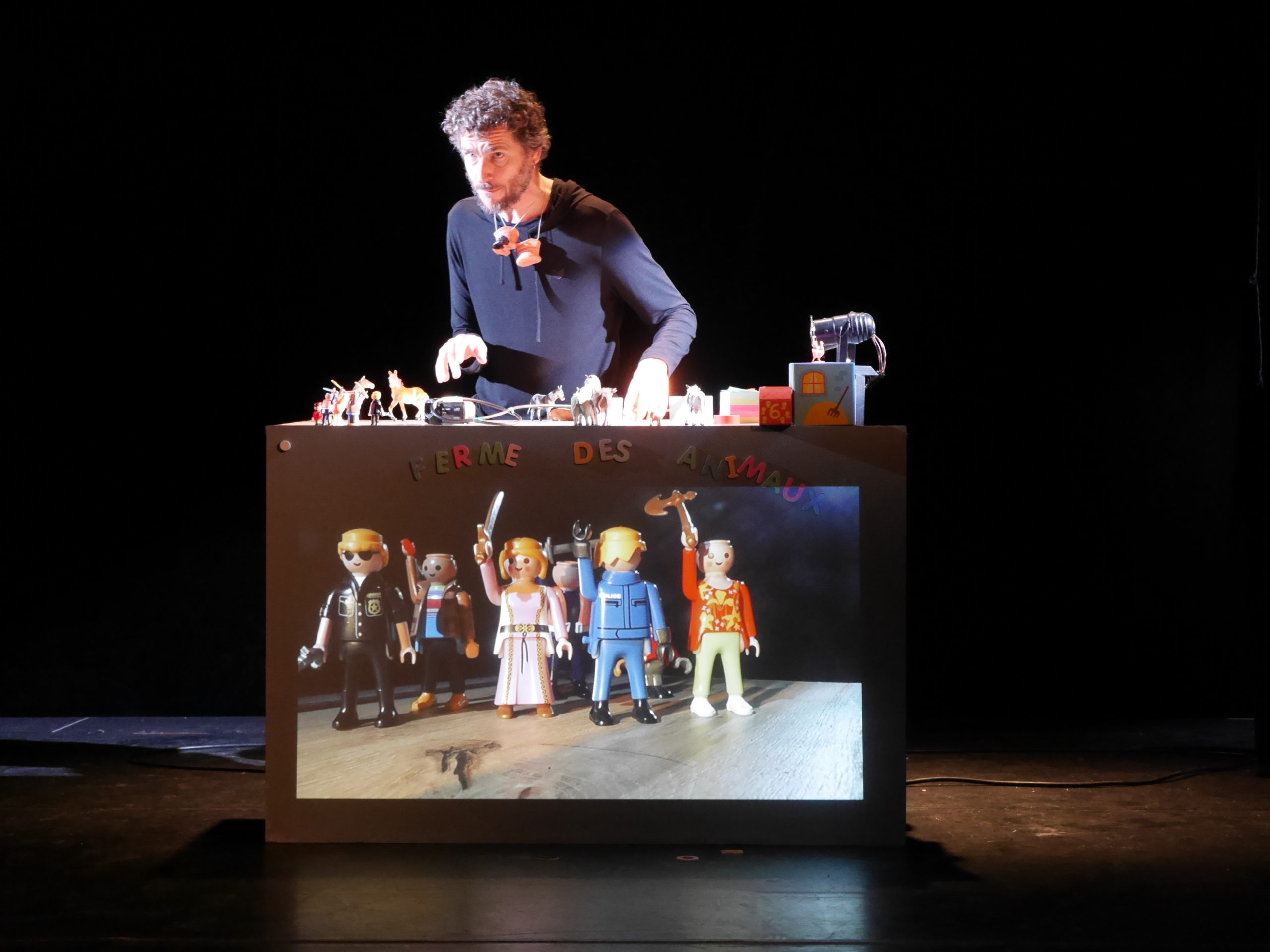 Seul sur scène, il interprète la révolte des animaux de la ferme contre leurs maîtres. Ils prennent le pouvoir et, après avoir chassé les hommes, tentent de vivre sans eux . . .